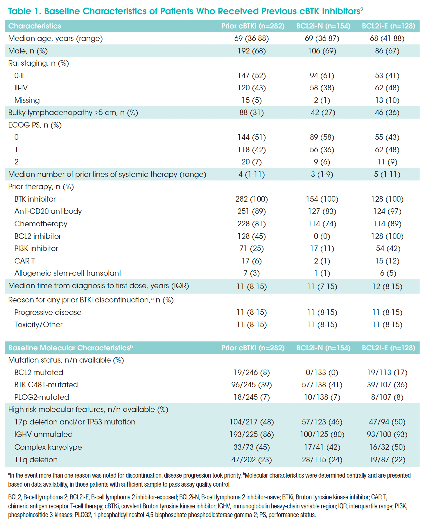 A total of 778 patients with B-cell cancers were enrolled; 317 had relapsed or refractory CLL or SLL after a data cutoff of May 2023 (approximately 30 months of follow-up).2 Two-hundred eighty-two patients with CLL or SLL previously received at least 1 BTK inhibitor. Of those 282 patients, 154 patients with CLL or SLL did not have previous BCL2 inhibitor exposure (BCL2i-N) and 128 patients did have previous BCL2 inhibitor exposure (BCL2i-E).2 Baseline characteristics of patients who received previous cBTK inhibitors are shown in Table 1.