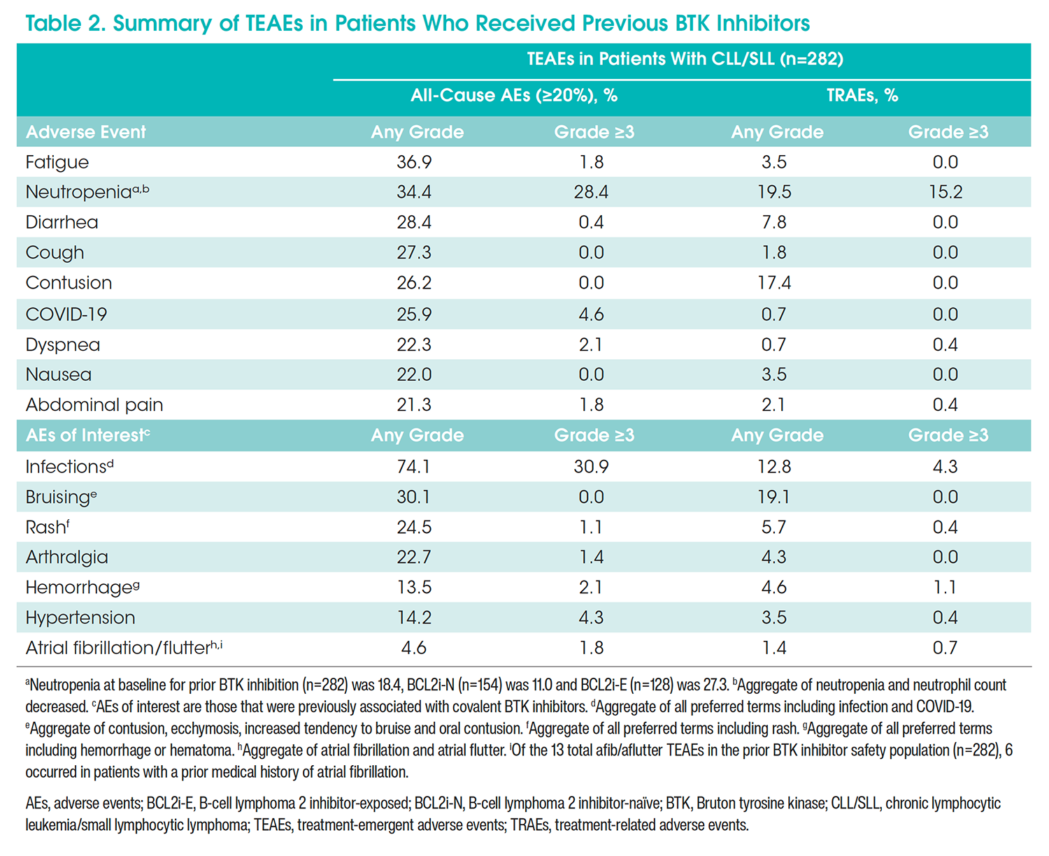 Among all 282 patients with CLL/SLL who received previous BTK inhibitors, treatment-related adverse events (TRAEs) of interest of any grade included infection (12.8%), bruising (19.1%), rash (5.7%), arthralgia (4.3%), hemorrhage (4.6%), hypertension (3.5%), and atrial fibrillation/flutter (1.4%). Grade ≥3 TRAEs of interest included infection (4.3%), rash (0.4%), hemorrhage (1.1%), hypertension (0.4%), and atrial fibrillation/flutter (0.7%) (Table 2).2