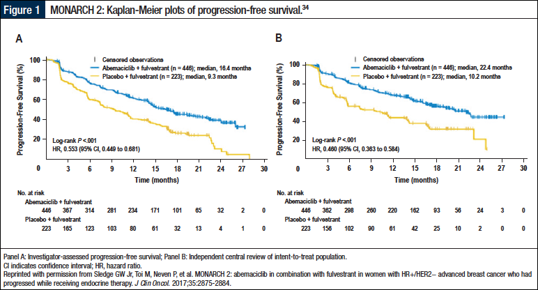 34. Sledge GW Jr, Toi M, Neven P, et al. MONARCH 2: abemaciclib in combination with fulvestrant in women with HR+/HER2− advanced breast cancer who had progressed while receiving endocrine therapy. J Clin Oncol. 2017;35:2875-2884.