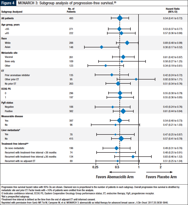 A PFS benefit was demonstrated across all prespecified subgroups (Figure 4).35 Although there was no interaction seen between race and treatment effect in the MONARCH 2 study, a greater PFS hazard ratio was observed in the Asian population than in the white population in MONARCH 3.34 In exploratory subgroup analyses, the hazard ratios for the abemaciclib arm versus the placebo arm were consistent across subgroups relating to prognosis and endocrine sensitivity (eg, treatment-free interval, metastatic site). Of note, patients with a short treatment-free interval or liver metastases benefited substantially from the addition of abemaciclib.