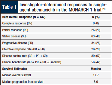 On the basis of the single-agent activity described above, the phase 2 MONARCH 1 study was launched. This was a multicenter, single-arm, open-label study designed to evaluate the single-agent activity of abemaciclib and further characterize the AE profile in patients with HR+/HER2− MBC who had previously received cytotoxic chemotherapy for the disease.28 This is a population for whom ET would no longer be considered suitable.