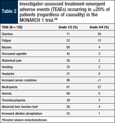 In MONARCH 1, the most common treatment-emergent AEs of any grade were diarrhea, fatigue, nausea, and decreased appetite (Table 2).28 Of the 132 study patients, 119 (90.2%) experienced diarrhea, typically grade 1 (n = 55; 41.7%) or grade 2 (n = 38; 28.8%) and, less frequently, grade 3 (n = 26; 19.7%). Diarrhea tended to occur early after initiation of therapy (median time to onset, 7.0 days) and was generally limited in duration (median duration of diarrhea: grade 2, 7.5 days; grade 3, 4.5 days; grade 4, no events).