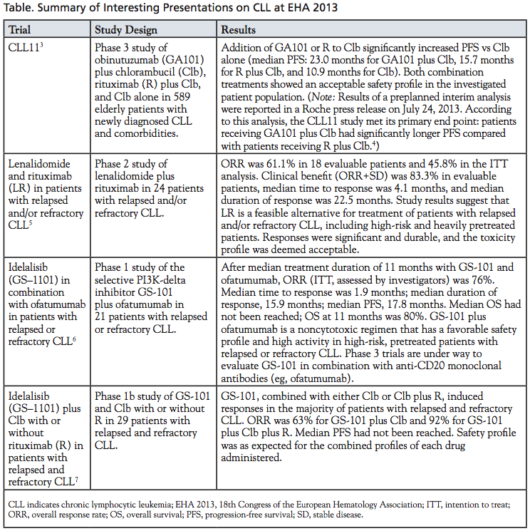 Chronic lymphocytic leukemia (CLL) is characterized by progressive accumulation of functionally incompetent lymphocytes. Combination chemotherapy regimens used in CLL typically include nucleoside analogues (fludarabine), alkylating agents (cyclophosphamide), and biologics (alemtuzumab, ofatumumab, rituximab). Allogeneic stem cell transplantation is the only known curative therapy. Novel therapies under investigation in CLL include monoclonal antibodies, kinase inhibitors, and cytotoxic agents. Key presentations and posters on the results of trials in patients with CLL are summarized in the Table.