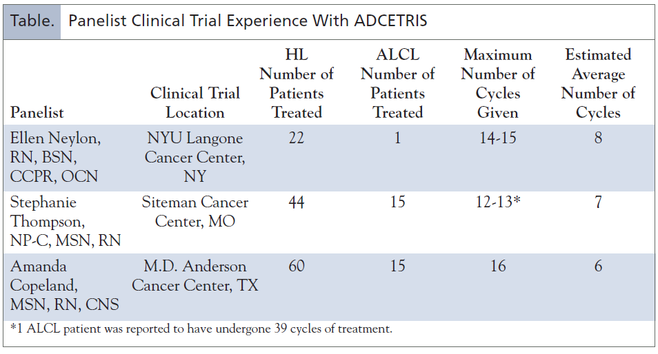 The roundtable convened a group of 3 APNs experienced in managing oncology patients in the clinical trial setting. The roundtable panelists shared their insights and knowledge about management approaches in the treatment of HL and ALCL. The Table shows the self-reported information about their experience in treating patients with ADCETRIS.