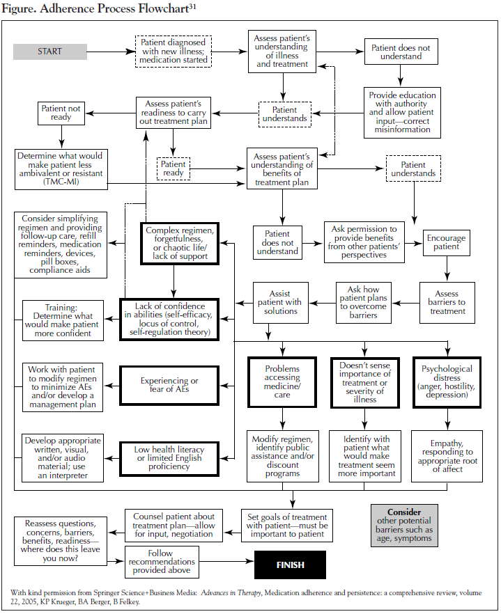 Due to the lack of evidence-based guidance on interventions to improve therapy adherence, recommendations from experts in the field are important to consider. A number of reviews have been published. Recommended methods to address specific risk factors for nonadherence are shown in the Table and in the flowchart in the Figure. In addition to being employed during initial therapy discussions with the patient, the approaches described should also be a part of routine follow-up to reinforce earlier exchanges and detect any new issues that have arisen. Once a patient is prescribed a regimen, the estimation of whether that patient is adherent is not easy.20 Physicians’ reliance on their own intuition is often ineffective; physicians are typically not highly accurate in assessing whether a patient is adhering to therapy and why a patient chooses to adhere. Asking patients nonjudgmentally about medication-taking behavior is a practical strategy to identify poor adherence, while attempts to “catch” patients in nonadherence can be problematic because patients are less likely to be truthful if they feel a risk of criticism. Thus, many of the interpersonal factors that are associated with the clinician-patient relationship come into play with difficulties in adherence assessment. The risk of worsening adherence behavior itself, thus potentially resulting in worsening overall outcomes, should be considered during every patient encounter.