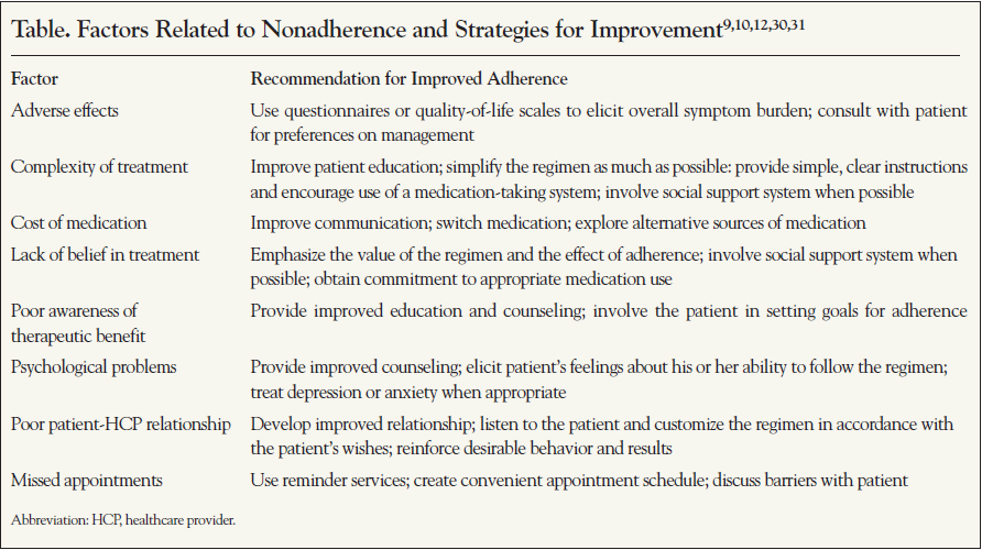 Direct communication with all patients about their personal barriers to taking daily therapy for a prolonged period is an important aspect to maximizing adherence, although time constraints in a busy practice may make this difficult. As described in detail in the previous article in this series, a number of barriers and risk factors have been associated with poor adherence and can be considered when developing a triage strategy for those most in need of in-depth discussion9-17:
